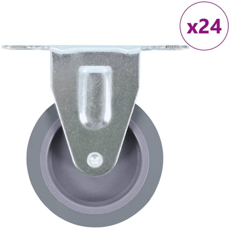 Questo set, composto da 24 rotelle fisse, costituisce l'accessorio perfetto per attrezzature e mobili di piccole dimensioni come banchi da lavoro, carrelli, tavolini da caffè, piantane, scaffali, carrelli della spesa, etc. Le ruote sono realizzate in TPR (gomma termoplastica), un materiale caratterizzato da un'ottima resistenza agli urti e alle vibrazioni e che consente alle ruote di girare in modo fluido e silenzioso. La loro superficie morbida, inoltre, protegge efficacemente il pavimento dai graffi. La struttura in ferro zincato è altamente resistente alla ruggine e fornisce una maggiore robustezza e durata alle ruote. Ogni ruota possiede una capacità di carico massima di 45 kg. La consegna include 24 rotelle fisse. Colore: Grigio Materiale: TPR (gomma termoplastica) e ferro zincato Diametro della rotella: 75 mm Larghezza della ruota: 27 mm Dimensioni della piastra: 65 x 65 mm (L x P) Distanza del foro: 49 x 49 mm Altezza di costruzione: 92 mm Capacità di carico massima: 45 kg (per