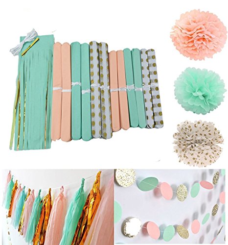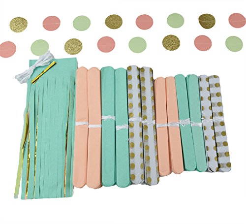1 pack of peach mint gold mixed color paper tassel with one white ribbon and using instruction,totally 12 sheets,each color comes with 4 pcs. 2pcs peach glitter gold mint mixed color of polka dot garland. Paper Garland Length: approximately 6.5 feet.