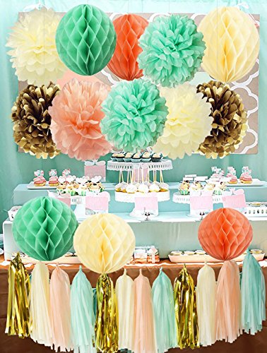 Realizzato con la carta velina poms pom di alta qualità e palle a nido d'ape di menta popolare color crema verde del pesco. Può essere utilizzato più e più volte.
