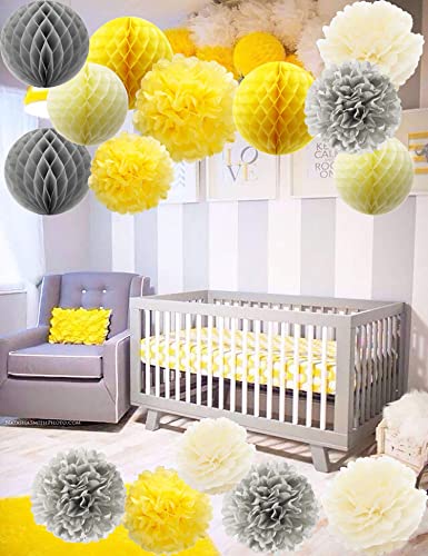 You Are My Sunshine Decorazioni Baby Shower Giallo grigio crema Pompons di carta velina palline set di fiori lista del pacchetto: 9pcs pom pom del tessuto: 3 pezzi giallo (1pcs 8inch + 1pcs 10inch + 1 * 12inch);