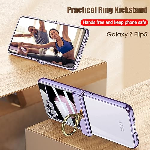 Furwabo Custodia Trasparente per Samsung Galaxy Z Flip 5 con Protezione Cerniera Magnetica e Supporto ad Anello & Proteggi Schermo Esterno,Placcatura Chiaro Antiurto Cover per Samsung Z Flip 5 (Viola)