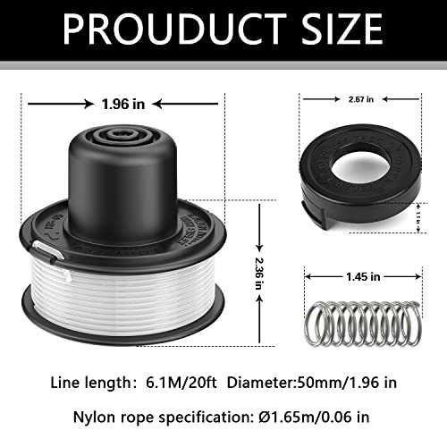 【Bobina per Decespugliatore】 Sostituzione perfetta per il modello A6226-XJ. Include 3 bobine di rifinitura, 1 copertura della bobina di rifinitura dell'erba e 1 molla, la lunghezza della bobina è di 20 piedi, il diametro è di 1,96 pollici e l'altezza è di 1,1 pollici.