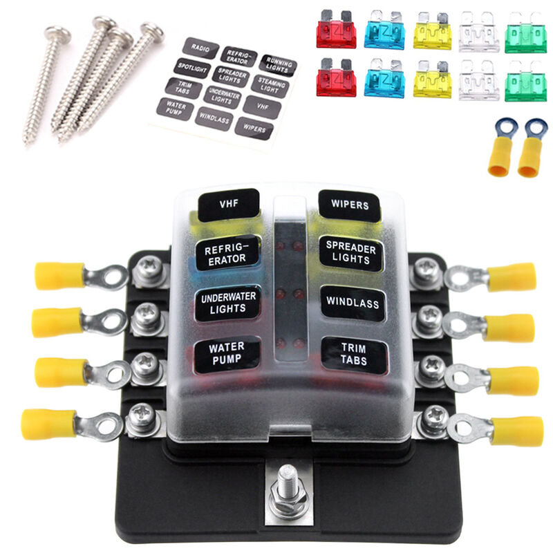 Questa scatola fusibili è adatta a tutti i tipi di applicazioni automobilistiche e marine, compresi i sistemi a 6, 12 e 24 V (tensione massima 32 v). Scatola dei fusibili a 8 vie con indicatore LED + Fusibili da 10 pezzi + 10 pezzi Terminali + 1 decalcomania Caratteristiche: Scatola portafusibili a 8 vie con fusibili 10A, 15A, 20A, 25A, 30A. Il cablaggio a vite è più robusto e forniamo 10 pezzi di terminali per te. Con l'indicatore di avvertimento LED rosso, se un fusibile spegne il LED rosso accanto al fusibile guasto, si illumina consentendo un'identificazione rapida e senza problemi di un guasto. Coperchio in plastica trasparente con sistema di chiusura a scatto, design facile da usare, resistente agli schizzi e alla polvere. Ampiamente usato per auto, barca, marine, caravan, yacht e così via. Specifiche tecniche: Colore nero Materiale: Base: PBT, Copertura: PC, Terminale: rame nichelato, Vite: acciaio inossidabile, Etichetta: PP * 40 Fusibile accettante: fusibile standard per lama