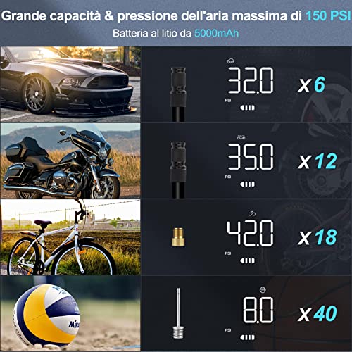 Pompa elettrica portatile: la pompa ad aria wireless per auto dispone di una batteria ad alte prestazioni di lunga durata. I valori di pressione fino a 150 PSI possono essere regolati con quattro modalità di gonfiaggio, PSI, BAR, KPA, kg/cm². La pompa ad aria per bicicletta blocca automaticamente il gonfiaggio quando viene raggiunta la pressione dei pneumatici preimpostata, caricare completamente la pompa elettrica prima dell'uso e stringere il tubo di gonfiaggio rimovibile per evitare perdite d'aria. evitare di perderli.