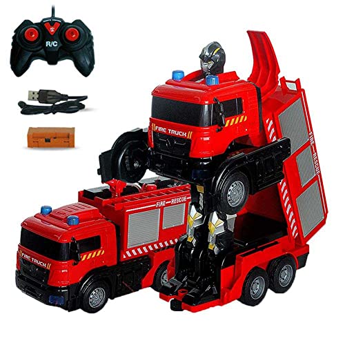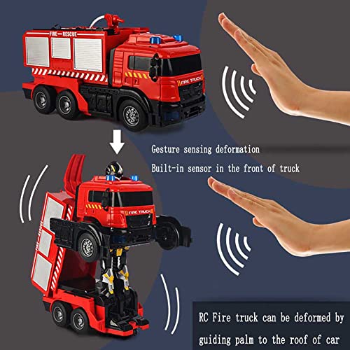 FXQIN Camion dei Pompieri Telecomandato con Funzione Spruzza Acqua, Luce e Suoni, Robot di Trasformazione per Auto RC Veicolo da Cantiere Radiocomando per Bambini Anni 3 +