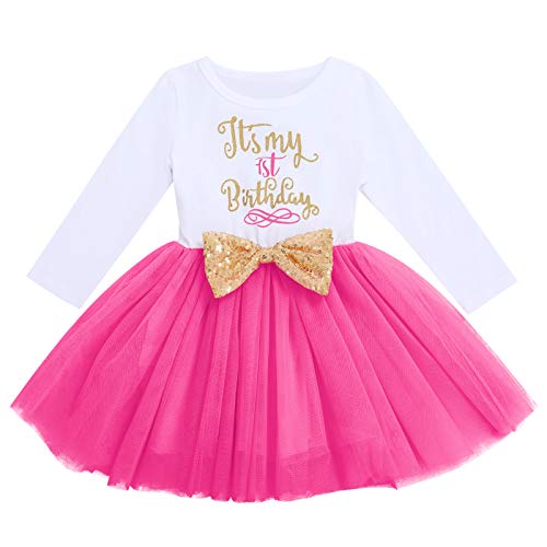 FYMNSI Vestito da bambina per il compleanno, in cotone e tulle, a maniche lunghe, con scritta in lingua inglese e linea ad A, in stile da principessa, per feste di compleanno di 1, 2 o 3 anni e servizi fotografici, con fascia per i capelli, Rose - Es ist Mein 1° Geburtstag, 12 mesi