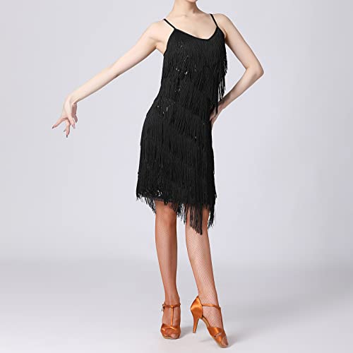 FYMNSI Vestito da danza latina, da donna, con paillette, frange, costume Gatsby, per feste di compleanno 20, senza maniche, per travestimento da sala da Zumba e Chacha, Nero, S