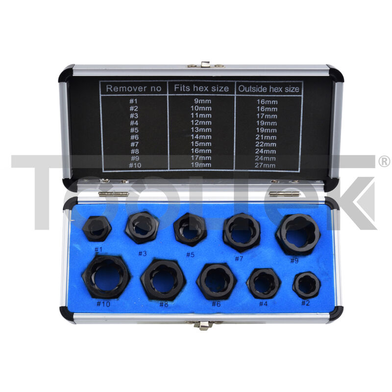 Set di bussole estrattori per dadi e bulloni spanati.Grazie al particolare profilo interno a spirale permette di svitare ed estrarre con estrema facilità i dadi e i bulloni con la testa dal profilo rovinato o slabbrato.Utilizzabile con chiave tradizionale o inglese fissa.MISURE: 9 - 10 - 11 - 12 - 13 - 14 - 15 - 16 - 17 - 19 mm.
