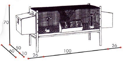 Gabbia per conigli con 2 nidi esterni, completa di mangiatoie, abbeveratoi, padella raccolta deiezioni, posatoio riposa zampe e divisorio che funge da portafieno. Misure utili gabbia cm.100x50 - Misura totale circa cm.152x50
