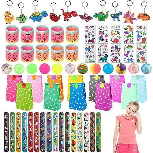 Gadget Compleanno Dinosauri - 7 tipi di riempitivi per sacchetti per feste per soddisfare le diverse esigenze dei bambini in diversi momenti del gioco. Compresi palline rimbalzanti, mini smiley springs, sacchetti regalo di carta, portachiavi dinosauro, braccialetti slap a 2 temi, tatuaggi temporanei bambini a 2 temi.