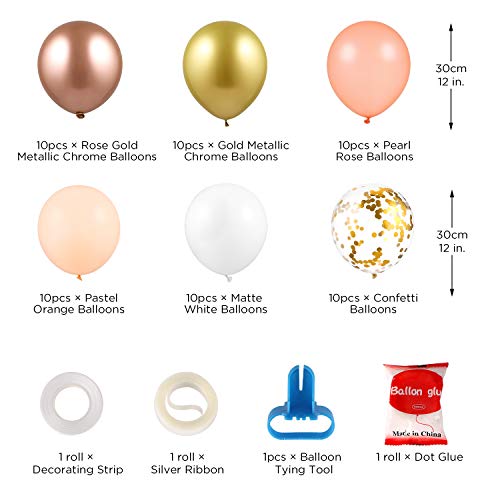 Palloncini in lattice da 12 pollici ogni colore ha 10 pezzi in corallo pastello, oro cromato metallizzato, oro rosa cromato metallizzato, oro rosa metallizzato, oro rosa perla, bianco opaco e coriandoli. Disporre quei palloncini colorati assortiti per decorare arco, ghirlanda, cuore o qualsiasi forma come preferisci.