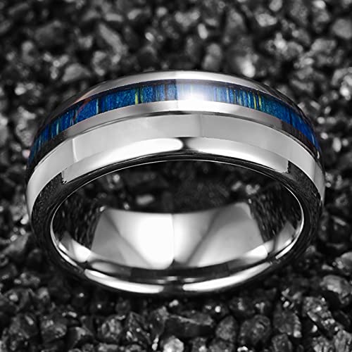 Legno blu e madreperla sono intarsiati sulla superficie dell'anello con una fodera in tungsteno d'argento, stile bombato, creano un gioiello nobile ed elegante.