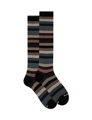 Calze lunghe da donna in cotone, realizzate in Italia. Incredibilmente morbide al tatto, create per una donna dinamica che non rinuncia ad un dettaglio di stile. La fantasia a righe pari nei toni del grigio le rende originali ma riconoscibili. Adatte ad un look formale o stravagante. La scritta Gallo è ricamata in punta a contrasto.