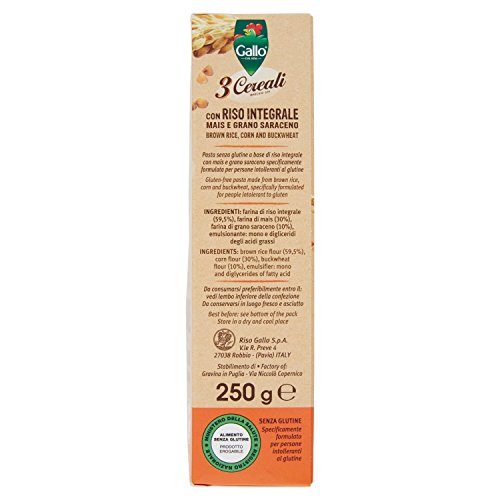 Riso Gallo Penne Rigate 3 Cereali con Riso Integrale, Mais e Grano Saraceno - Confezione da 250 gr, Senza glutine