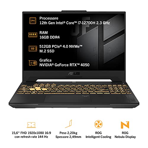 ASUS TUF Gaming F15 FX507ZU4#B0BYZM6PBR, Notebook 15,6" Antiglare, 144Hz, Intel Core 12ma gen i7-12700H, RAM 16GB, 512GB SSD PCIE, NVIDIA® GeForce RTX™ 4050 6GB GDDR6, Windows 11 Home, Grigio