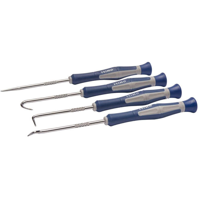 Set di 4 ganci irimo 722-4-1. utilizzati per l'installazione o la rimozione di molle e o-ring, per la pulizia di scanalature, ecc. comprende: gancio dritto, gancio angolare, gancio pieno e gancio a 90°. impugnatura morbida bi-componente. lunghezza: 170 mm. lame in acciaio al carbonio e punte temprate.