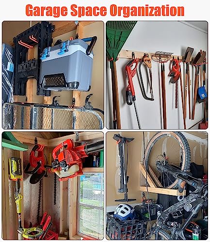 【Design unico】Il design a doppio braccio del gancio del garage rende la forza più equilibrata e stabile. Adatto per appendere pale, scale, biciclette, scope, sedie piegate, tubi, utensili elettrici e attrezzi da giardinaggio. Il doppio gancio aggiunge un gancio ondulato, in grado di gestire strumenti difficili da organizzare, come tubi, corde, fili, ecc., in modo che gli oggetti possano essere appesi saldamente. Il guscio di gomma arancione può ridurre l'attrito degli oggetti.