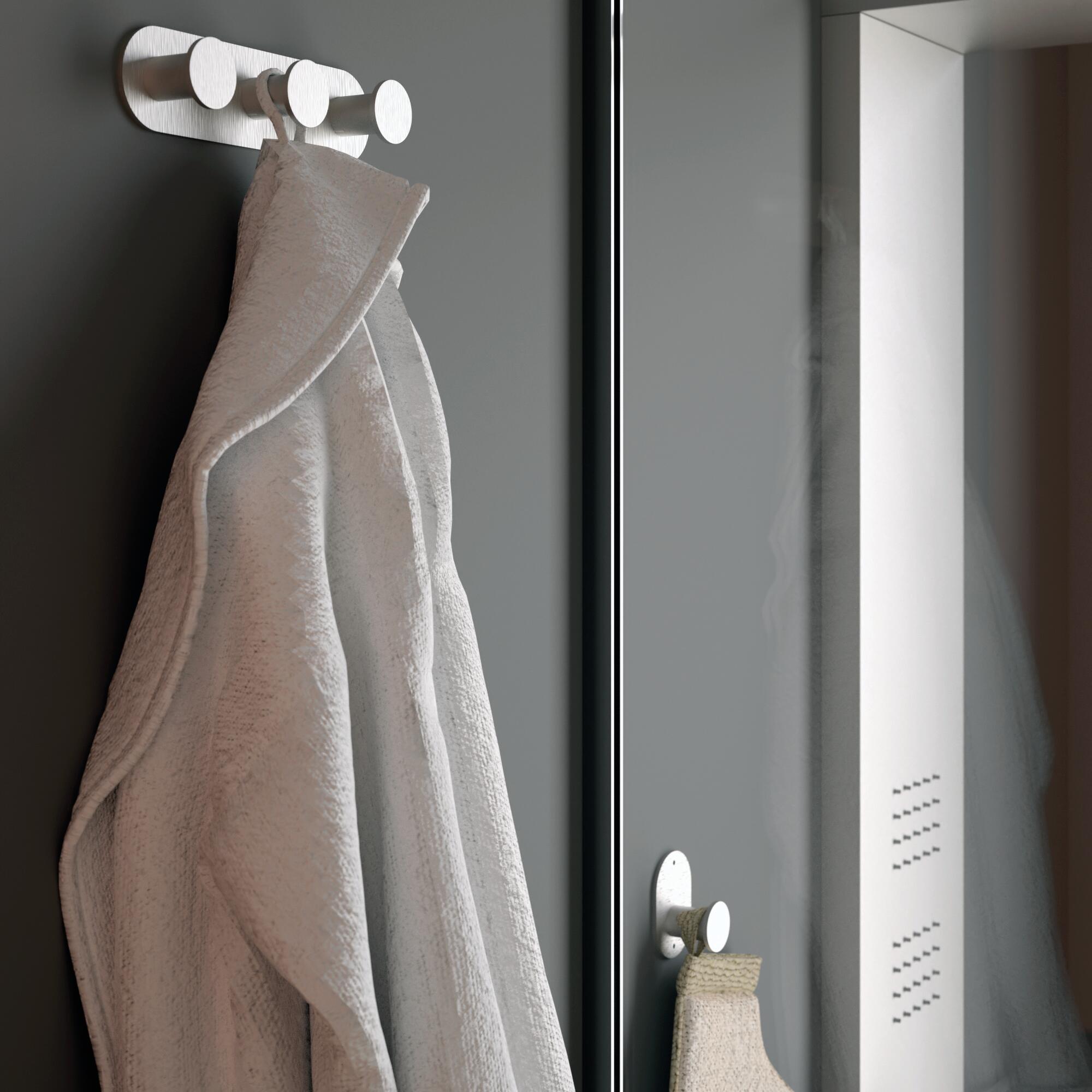 Blizz appendiabito triplo in acciaio inox spazzolato, ideale per appendere accappatoi e asciugamani. adatto ad ambienti interni.. APPENDERE ACCAPPATOI E ASCIUGAMANI DI VARIE DIMENSIONI IN SPAZI CONTENUTI. L'acciaio Inox AISI 304 (18/10) è un materiale ben noto per la sua qualità e resistenza anche in ambienti umidi come il bagno.. DOPPIO SISTEMA DI FISSAGGIO: 1) con viti estetiche a vista dal design ultra-piatto, realizzate in acciaio Inox AISI 304 (18/10);
