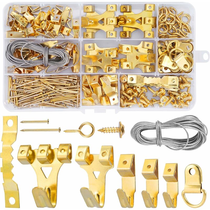 Acciaio inossidabile - I ganci per quadri sono realizzati in acciaio inossidabile di alta qualità. che sono durevoli e non facilmente deformabili. Possono supportare un carico fino a 75 libbre 【250 unità in 1 confezione 】Con 60 ganci e 190 altri accessori in questa confezione. La confezione include 25 ganci in acciaio da 10 libbre, 15 ganci in acciaio da 20 libbre, 10 ganci in acciaio da 30 libbre, 6 ganci in acciaio da 40 libbre, 4 ganci in acciaio da 75 libbre, 30 chiodi corti, 69 chiodi lunghi, 40 viti, 20 anelli viti, 20 anelli a D, 10 dorsi a dente di sega e un filo d'acciaio da 3 m tutto riposto. in una pratica valigetta 【Versatile 】Questo hardware per appendere quadri è composto da 11 diversi tipi di componenti, puoi sicuramente trovare quello che ti serve. Possono essere utilizzati per appendere quadri, quadri, orologi, decorazioni, luci, utensili da cucina o persino vestiti 【Configurazione semplice 】Tutto quello che devi fare è posizionare il gancio sul muro e usare un