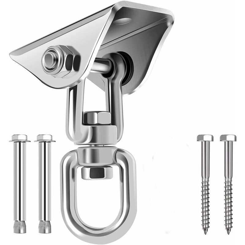 SOLIDA E COMPLETA: Realizzato in acciaio inossidabile 304 di alta qualità, durevole, ad alta resistenza, resistente alla corrosione, elevata durezza, ruggine e resistente all'acqua. robusto e sicuro Ampia gamma di applicazioni: i nostri ganci sono adatti per sedie sospese, amache, supporti per sacchi di sabbia, altalene, asciugamani per lo yoga, sedie sospese, tende da sole, altalene per bambini, sedie svedesi, sedie sospese, altalene dell'amore, scarpe da ginnastica, ecc. Design girevole a 360°: La spirale in acciaio inox consente la rotazione libera di 360°, prevenendo la torsione della sospensione (corda, catena, cinghia, ecc.) e proteggendola dall'usura e per un maggiore utilizzo. Come parco giochi, altalena, altalena da balcone o amaca Facile da installare: è necessario preforare due fori nella trave di legno o cemento, quindi installare le viti. Volume di consegna: 1 staffa per soffitto, 2 viti per legno, 2 viti di fissaggio Nota: le amache possono essere fissate solo a