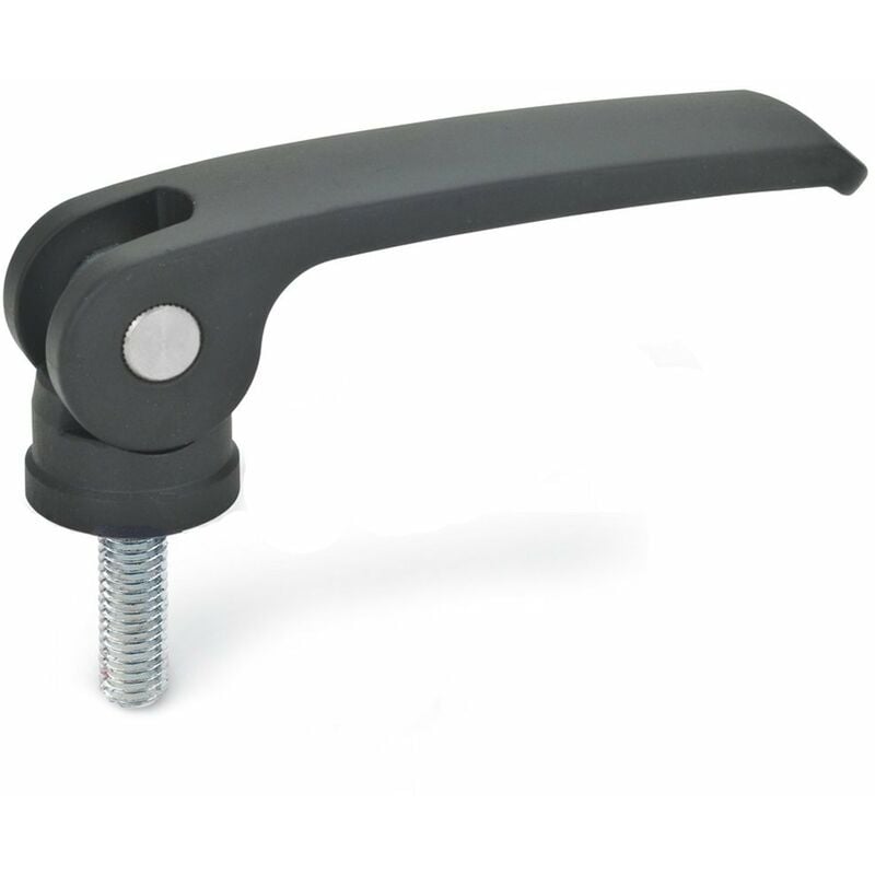 Manico lunghezza l1: 101 mm, D filettatura: M8, lunghezza filettatura in posizione L2: 35 mm, Hub H: 1 tenditore, 5 mm Forma B: disco di plastica cuscino disco senza dado, regolazione: Termoplastica (poliammide) rinforzato con fibra di vetro Leva: zinco pressofuso, rivestimento in plastica, silicone poliuretanico inodore epossidico resina, nero, RAL 9005 Asse, treno dado: acciaio zincato, blu passivato Conforme a RoHS