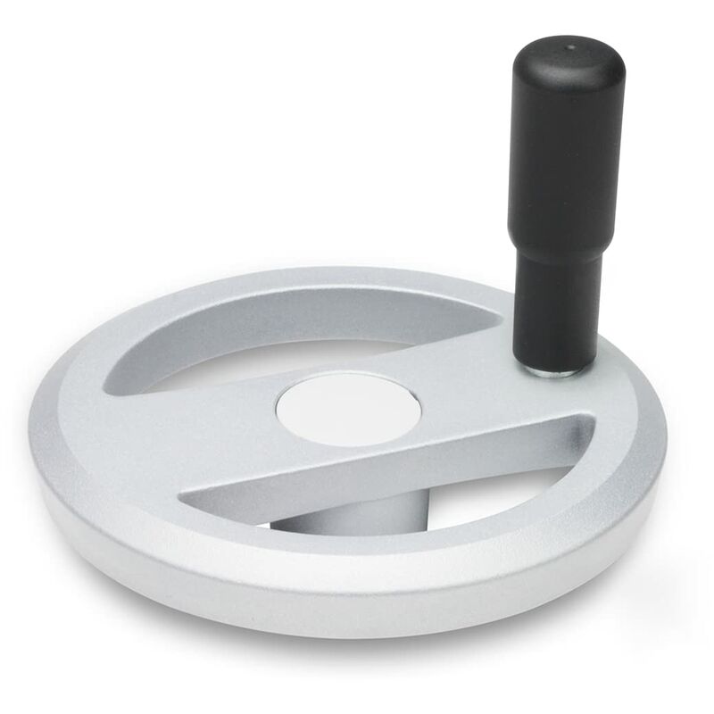 Diametro: 125 mm, Canneggio D1 D2: 12 mm, Larghezza: 15 mm, Lunghezza mozzo L1: 18 mm, Lunghezza Manico L2: 61,5 mm Alluminio pressofuso, Ruota Mozzo mano, Corona ritorto Rivestimento in plastica: argento, RAL 9006, strukturmatt Cilindro girevole maniglie GN 798 termoplastica: plastica,, Colore: Nero, opaco Rotondo da corsa e piano deviazione del senza pedali kranzes < 0,4