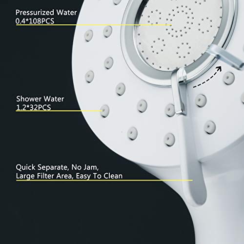 Alta pressione flusso d' acqua: La rivoluzionaria tecnologia Micro ugello rende il fori più piccoli e più dense, aumentando la velocità di uscita del flusso d' acqua, aumentando così la pressione dell' acqua. 200% pressione dell' acqua. Alta pressione soffione doccia vi fornirà acqua sufficiente, e inoltre fornisce prestazioni costanti potente spray anche a bassa pressione dell' acqua.