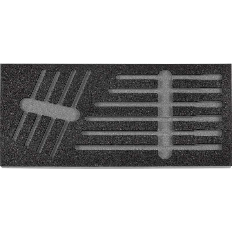 Assortimenti standard di utensili in alloggiamenti sagomati in espanso rigido bicolore in PE. La struttura non porosa dell'espanso è impermeabile e resistente agli oli. Strato superiore color antracite, quello inferiore di contrasto color grigio mette in evidenza gli utensili mancanti. Dati tecnici Tipo di prodotto Inserto in espanso rigido Forma in espanso rigido LD45, spessore, mm 30 Larghezza, mm 383 Numero di utensili 10 Shadow Board, mm 176 Profondità, mm 176 Esecuzione vuoto per assortimenti di utensili