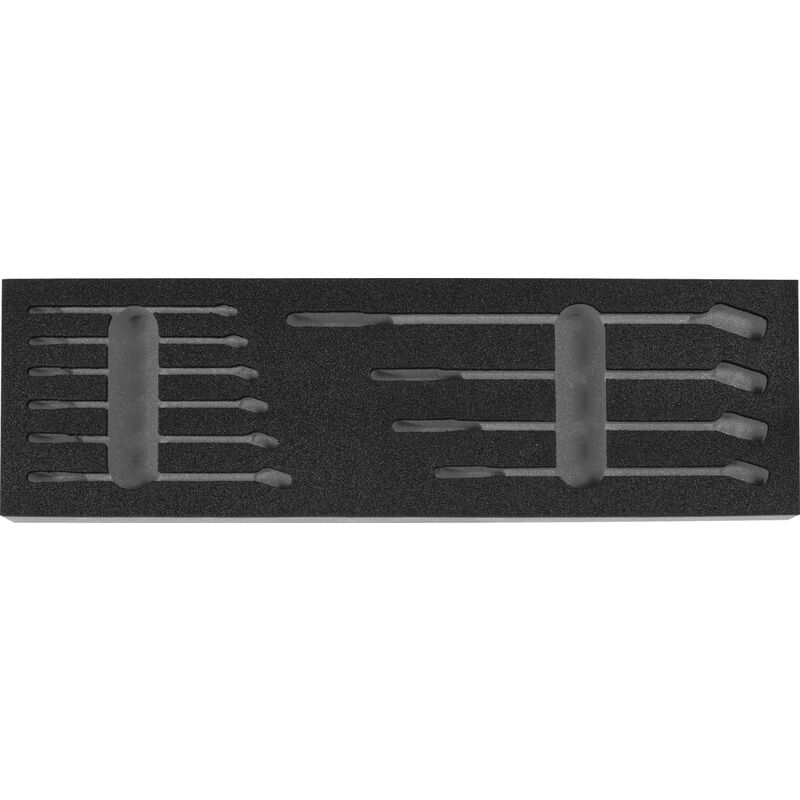 Assortimenti standard di utensili in alloggiamenti sagomati in espanso rigido bicolore in PE. La struttura non porosa dell'espanso è impermeabile e resistente agli oli. Strato superiore color antracite, quello inferiore di contrasto color grigio mette in evidenza gli utensili mancanti. Dati tecnici Tipo di prodotto Inserto in espanso rigido Forma in espanso rigido LD45, spessore, mm 30 Larghezza, mm 383 Numero di utensili 10 Shadow Board, mm 115 Profondità, mm 115 Esecuzione vuoto per assortimenti di utensili