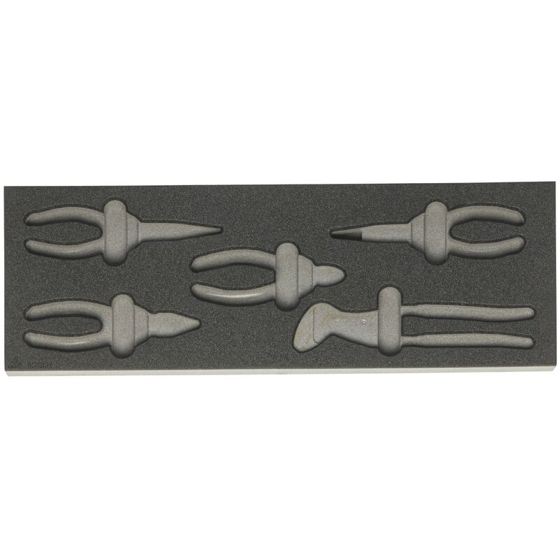 Assortimenti standard di utensili in alloggiamenti sagomati in espanso rigido bicolore in PE. La struttura non porosa dell'espanso è impermeabile e resistente agli oli. Strato superiore color antracite, quello inferiore di contrasto color grigio mette in evidenza gli utensili mancanti. Dati tecnici Tipo di prodotto Inserto in espanso rigido Larghezza in G 8 Profondità in G 24 Riempimento di un cassetto in G 8×24 Forma in espanso rigido LD45, spessore, mm 30 Larghezza, mm 200 Numero di utensili 5 Profondità, mm 600 Esecuzione vuoto per assortimenti di utensili