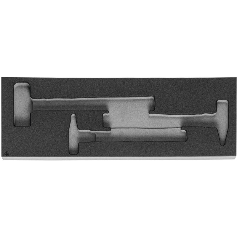 Assortimenti standard di utensili in alloggiamenti sagomati in espanso rigido bicolore in PE. La struttura non porosa dell'espanso è impermeabile e resistente agli oli. Strato superiore color antracite, quello inferiore di contrasto color grigio mette in evidenza gli utensili mancanti. Dati tecnici Forma in espanso rigido LD45, spessore 30 mm Riempimento di un cassetto in G 8×24 Larghezza 200 mm Profondità 600 mm Larghezza in G 8 Profondità in G 24 Numero di utensili 3 Esecuzione vuoto per assortimenti di utensili Tipo di prodotto Inserto in espanso rigido Codice articolo 952001 954672 EAN / GTIN 4062406093716