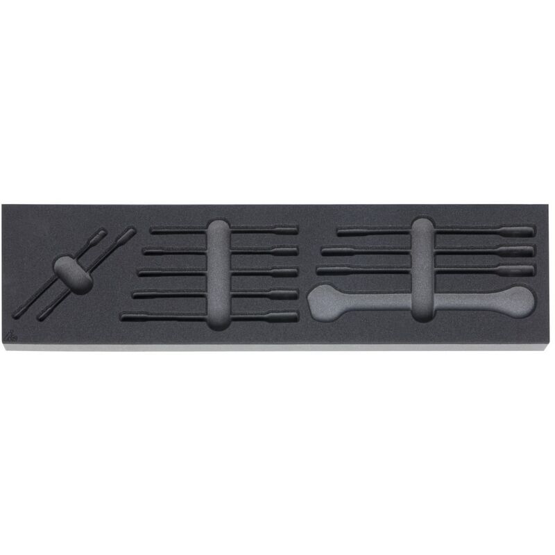 Assortimenti standard di utensili in alloggiamenti sagomati in espanso rigido bicolore in PE. La struttura non porosa dell'espanso è impermeabile e resistente agli oli. Strato superiore color antracite, quello inferiore di contrasto color grigio mette in evidenza gli utensili mancanti. Dati tecnici Tipo di prodotto Inserto in espanso rigido Larghezza in G 6 Profondità in G 24 Riempimento di un cassetto in G 6×24 Forma in espanso rigido LD45, spessore, mm 30 Larghezza, mm 150 Numero degli utensili 11 Profondità, mm 600 Esecuzione vuoto per assortimenti di utensili