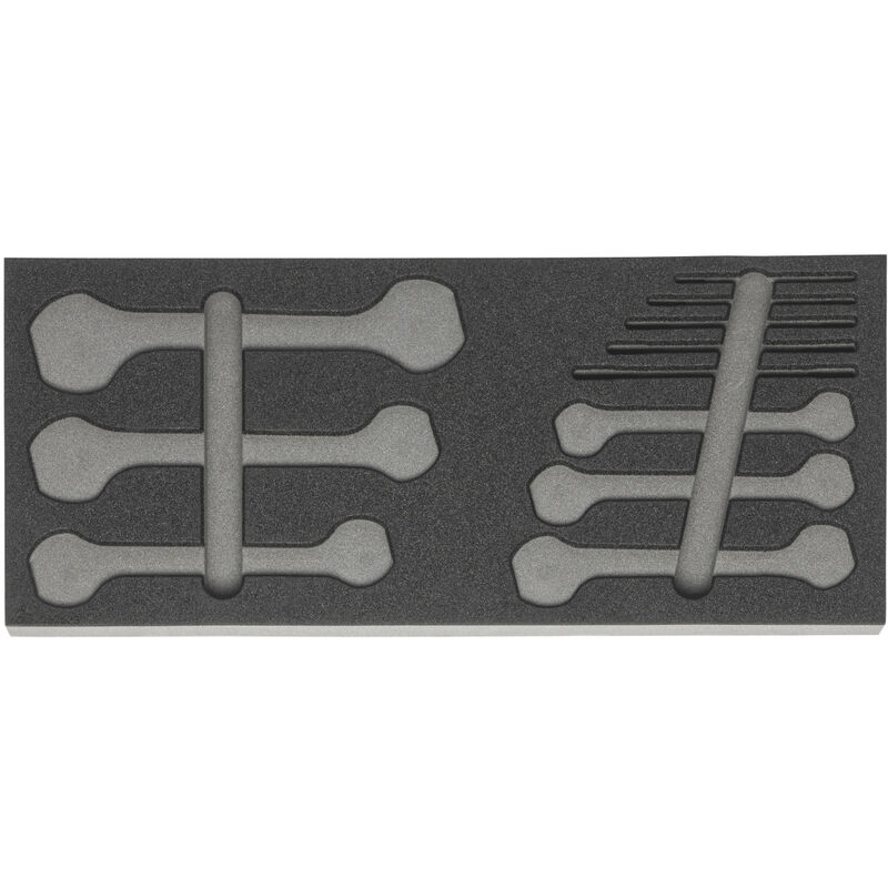 Assortimenti standard di utensili in alloggiamenti sagomati in espanso rigido bicolore in PE. La struttura non porosa dell'espanso è impermeabile e resistente agli oli. Strato superiore color antracite, quello inferiore di contrasto color grigio mette in evidenza gli utensili mancanti. Dati tecnici Tipo di prodotto Inserto in espanso rigido Larghezza in G 10 Profondità in G 24 Riempimento di un cassetto in G 10×24 Forma in espanso rigido LD45, spessore, mm 30 Larghezza, mm 250 Numero degli utensili 11 Profondità, mm 600 Esecuzione vuoto per assortimenti di utensili
