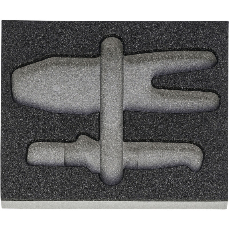 Assortimenti standard di utensili in alloggiamenti sagomati in espanso rigido bicolore in PE. La struttura non porosa dell'espanso è impermeabile e resistente agli oli. Strato superiore color antracite, quello inferiore di contrasto color grigio mette in evidenza gli utensili mancanti. Dati tecnici Tipo di prodotto Inserto in espanso rigido Larghezza in G 8 Profondità in G 10 Riempimento di un cassetto in G 8×10 Forma in espanso rigido LD45, spessore, mm 30 Larghezza, mm 200 Numero di utensili 2 Profondità, mm 250 Esecuzione vuoto per assortimenti di utensili