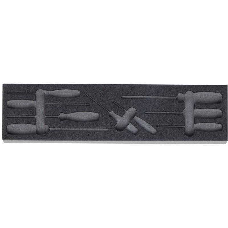 DescrizioneEsecuzione:Assortimenti standard di utensili in alloggiamenti sagomati in espanso rigido bicolore in PE. La struttura non porosa dell'espanso è impermeabile e resistente agli oli. Strato superiore color antracite, quello inferiore di contrasto color grigio mette in evidenza gli utensili mancanti.Dati tecnici Forma in espanso rigido LD45, spessore 30 mm Riempimento di un cassetto in G 6×24 Larghezza 150 mm Profondità 600 mm Larghezza in G 6 Profondità in G 24 Numero degli utensili 9 Esecuzione vuoto per assortimenti di utensili Tipo di prodotto Inserto in espanso rigido Codice articolo 952001 953372 EAN / GTIN 4062406155261