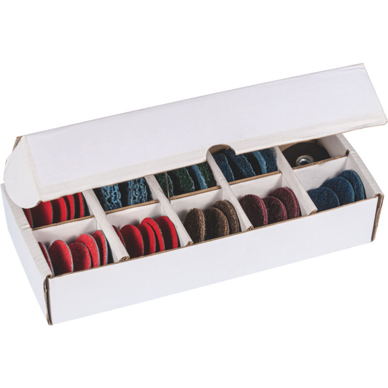 Set per il sistema di cambio rapido per rettifiche in più fasi con passi di lavorazione ottimizzati. Contenuto: Cad. 5× mole abrasive CER n. art. 554012 Dim. 36, 80 e 120. 2× spazzole per pulitura grezza SiC n. art. 554050 CRS. Cad. 3× spazzole per pulitura A n. art. 554054 Dim. MED, FINE. Cad. 3× dischi abrasivi per finitura A n. art. 554042 Dim. 100, 180 e 280. Platorello in gomma con ⌀ gambo 6 mm, medio-duro, 50 mm, n. art. 554093 50. Dati tecnici Tipo di prodotto Disco abrasivo Attributo del nome del prodotto ⌀ 50,8 mm Numero pezzi 33