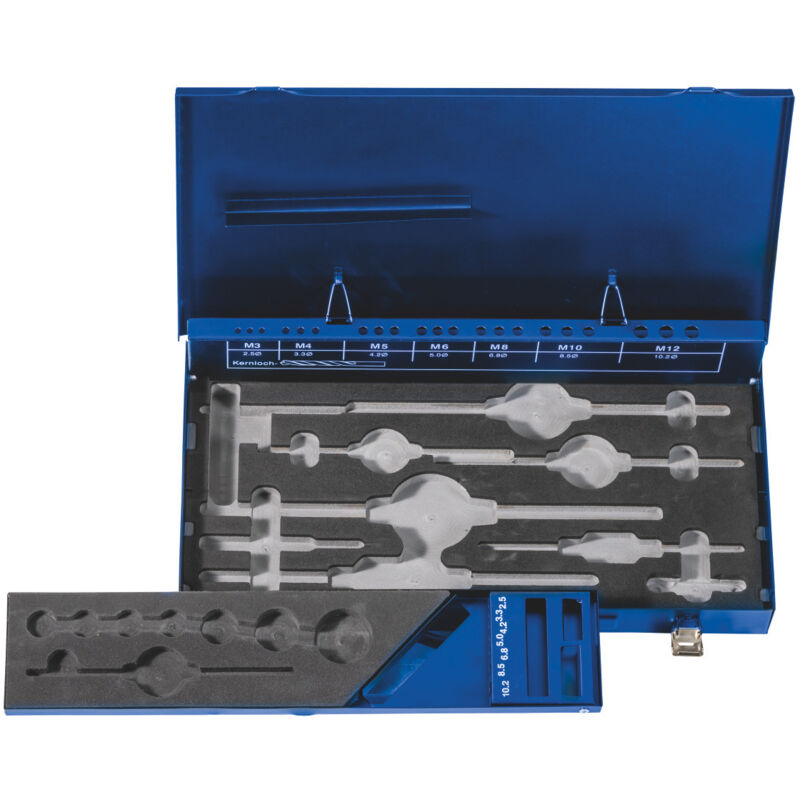 Robusta cassetta di lamiera con maniglia e 2 chiusure a eccentrico. Gli utensili possono essere trasportati in tutta sicurezza e sono sempre a portata di mano perché assicurati in supporti singoli. All'apertura la cassetta si trasforma in un comodo espositore, cosicché le punte si possono estrarre con facilità.