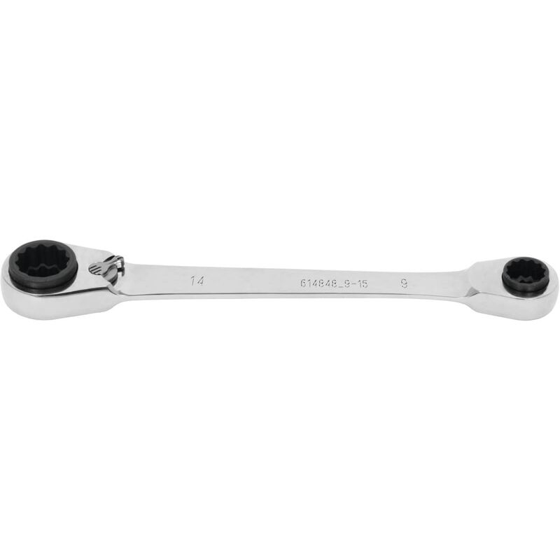 serraggio orario e antiorario. Ognuna delle 2 estremità presenta un'apertura diversa. Angolo di registro estremamente stretto: 5°. Materiale: Acciaio al cromo-vanadio, esecuzione cromata opaca. Dati tecnici Angolo di registro Grad 5 Materiale Acciaio al cromo-vanadio Superficie es. opaca cromata Cricchetto reversibile sì Numero di denti 72 Tipo di prodotto Chiave Apertura 1, mm 8 Apertura 4, mm 13 Apertura 2, mm 10 Apertura 3, mm 12 Dimensione apertura metrica Lunghezza complessiva L, mm 150 ⌀ Massimo anello D1, mm 20,2 ⌀ Massimo anello D2, mm 24,8 Altezza massima anello h1, mm 13,8 Altezza massima anello h2, mm 16,8
