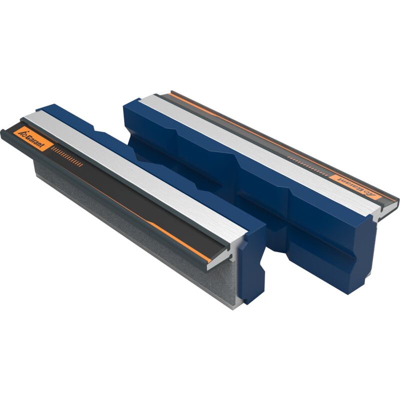 Ganasce per morse da banco in alluminio estruso. Con magneti permanenti integrati, adatti per tutte le morse da banco con larghezza ganasce corrispondente. Straordinaria forza di tenuta grazie all'ampia superficie magnetica. Superfici di serraggio in poliuretano, superfici di serraggio con prismi. Per: Tutti i modelli di morse da banco. Nota: Nuova esecuzione con il 50% in più di forza di tenuta. Dati tecnici Tipo di prodotto Ganasce per morsa a vite Larghezza ganasce, mm 100 Materiale Poliuretano Tipo di fissaggio Magnete permanente Tipo di superficie di serraggio Prisma