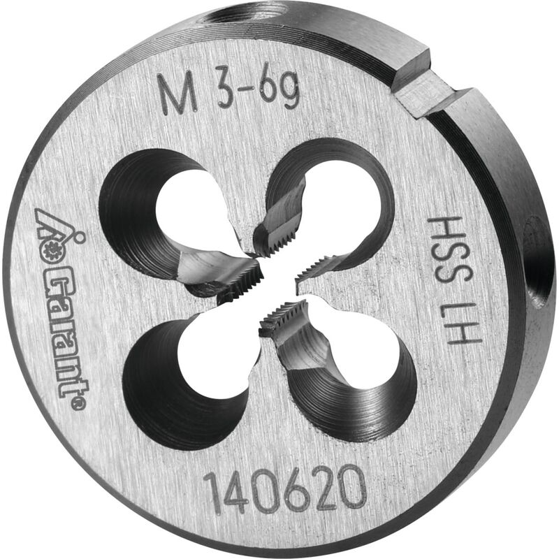 Forma chiusa preincisa. Imbocco a 1 spira e 3/4. Con imbocco corretto su entrambi i lati per agevolare l'esecuzione del filetto ed evacuare correttamente i trucioli nella direzione di taglio. Dati tecnici Olio idoneo Acciaio < 500 N/mm² m/min idoneo Acciaio < 750 N/mm² m/min idoneo a secco limitatamente adatto Alluminio (a truciolo corto) m/min limitatamente adatto Norma EN 22568 Tipo di filettatura M-LH Materiale da taglio HSS Angolo di filetto Grad 60 Direzione di taglio sinistro Tipo di prodotto Filiere Misura del filetto M3 Classe di tolleranza DIN 13 6g Passo, mm 0,5 Altezza, mm 5 ⌀ Esterno, mm 20