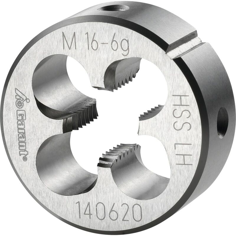 Forma chiusa preincisa. Imbocco a 1 spira e 3/4. Con imbocco corretto su entrambi i lati per agevolare l'esecuzione del filetto ed evacuare correttamente i trucioli nella direzione di taglio. Dati tecnici Olio idoneo Acciaio < 500 N/mm² m/min idoneo Acciaio < 750 N/mm² m/min idoneo a secco limitatamente adatto Alluminio (a truciolo corto) m/min limitatamente adatto Norma EN 22568 Tipo di filettatura M-LH Materiale da taglio HSS Angolo di filetto Grad 60 Direzione di taglio sinistro Tipo di prodotto Filiere Misura del filetto M16 Classe di tolleranza DIN 13 6g Passo, mm 2 Altezza, mm 18 ⌀ Esterno, mm 45