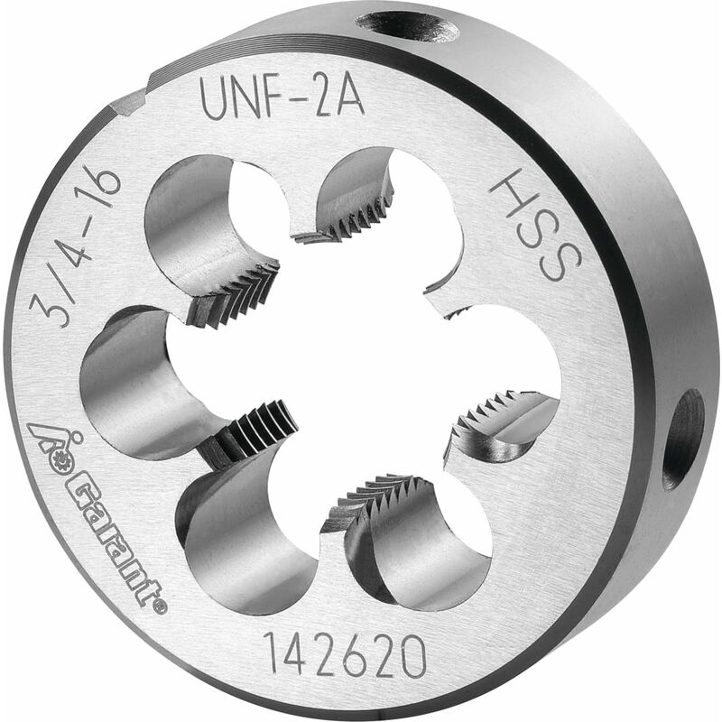 con imbocco corretto su entrambi i lati per agevolare l'esecuzione del filetto ed evacuare correttamente i trucioli nella direzione di taglio. Imbocco a 1 spira e 3/4. Uso: Per filettatura americana a passo fine UNF ASME − B1.1. Dati tecnici Acciaio < 750 N/mm² m/min idoneo Olio idoneo Acciaio < 500 N/mm² m/min idoneo a secco limitatamente adatto Alluminio (a truciolo corto) m/min limitatamente adatto Angolo di filetto Grad 60 Norma EN 22568 Classe di tolleranza 2A Materiale da taglio HSS Tipo di filettatura UNF Tipo di prodotto Filiere Misura del filetto 3/4-16 UNF Altezza, mm 14 Direzione di taglio destra Filetti per pollice 16 ⌀ Filettatura, mm 19,05 ⌀ Esterno, mm 45