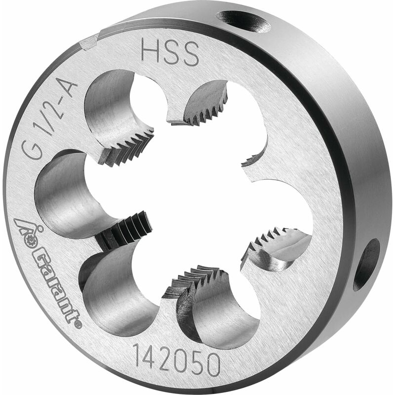 con imbocco corretto su entrambi i lati per agevolare l'esecuzione del filetto ed evacuare correttamente i trucioli nella direzione di taglio. Imbocco a 1 spira e 3/4.Uso:Per filettatura gas, Whitworth cilindrica DIN ISO 228/1.Dati tecnici Misura del filetto G1/2 Tipo di filettatura G Angolo di filetto 55 ° Materiale da taglio HSS Norma EN 24231 Filetti per pollice 14 ⌀ Filettatura 20,96 mm ⌀ esterno 45 mm Altezza 14 mm Classe di tolleranza A Direzione di taglio destra Tipo di prodotto Filiere Codice articolo 142050 G1/2 EAN / GTIN 4045197084613