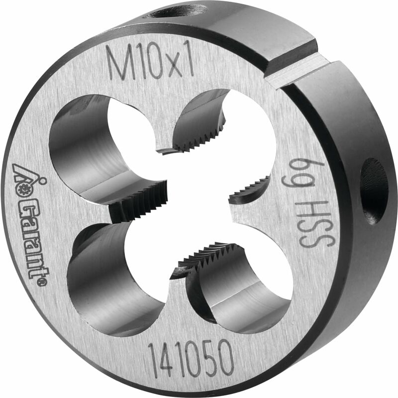 Forma chiusa preincisa con imbocco corretto su entrambi i lati. Imbocco a 1 spira e 3/4. Dati tecnici Olio idoneo Alluminio (a truciolo corto) m/min limitatamente adatto Acciaio < 500 N/mm² m/min idoneo a secco limitatamente adatto Acciaio < 750 N/mm² m/min idoneo Materiale da taglio HSS Tipo di filettatura MF Angolo di filetto Grad 60 Norma EN 22568 Direzione di taglio destra Tipo di prodotto Filiere Misura del filetto M10×1 Classe di tolleranza DIN 13 6g Passo, mm 1 Altezza, mm 11 ⌀ Esterno, mm 30
