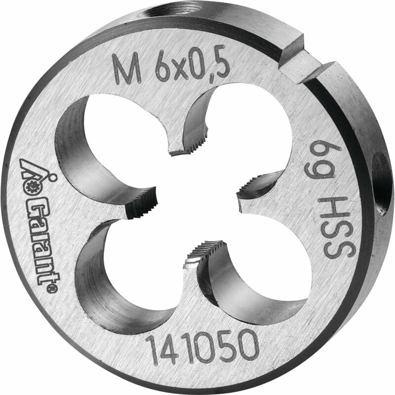 Forma chiusa preincisa con imbocco corretto su entrambi i lati. Imbocco a 1 spira e 3/4. Dati tecnici Olio idoneo Alluminio (a truciolo corto) m/min limitatamente adatto Acciaio < 500 N/mm² m/min idoneo a secco limitatamente adatto Acciaio < 750 N/mm² m/min idoneo Materiale da taglio HSS Tipo di filettatura MF Angolo di filetto Grad 60 Norma EN 22568 Direzione di taglio destra Tipo di prodotto Filiere Misura del filetto M6×0,5 Classe di tolleranza DIN 13 6g Passo, mm 0,5 Altezza, mm 5 ⌀ Esterno, mm 20