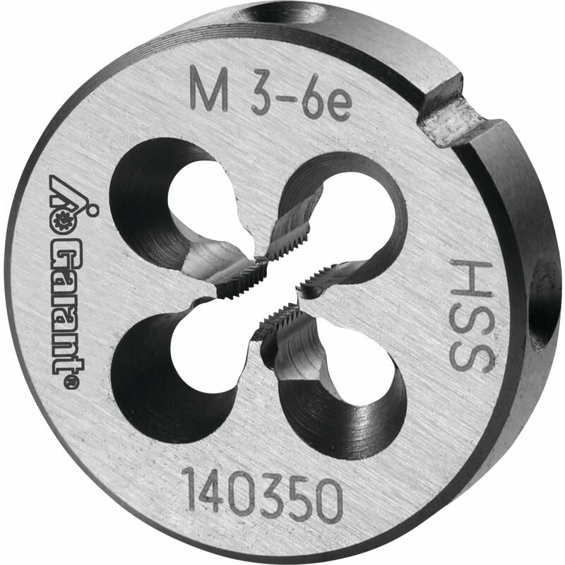 Forma chiusa preincisa. ≥ M3 con imbocco corretto su entrambi i lati per agevolare l'esecuzione del filetto ed evacuare correttamente i trucioli nella direzione di taglio. Imbocco a 1 spira e 3/4. Campo di tolleranza 6e = con sottomisura ca. 0,03 − 0,04 mm. Per la classe di tolleranza “media”, se i perni sono trattati con uno strato galvanico protettivo. Dati tecnici Olio idoneo a secco limitatamente adatto Acciaio < 750 N/mm² m/min idoneo Acciaio < 500 N/mm² m/min idoneo Alluminio (a truciolo corto) m/min limitatamente adatto Tipo di filettatura M Norma EN 22568 Direzione di taglio destra Materiale da taglio HSS Angolo di filetto Grad 60 Tipo di prodotto Filiere Misura del filetto M3 Classe di tolleranza DIN 13 6e Passo, mm 0,5 Altezza, mm 5 ⌀ Esterno, mm 20