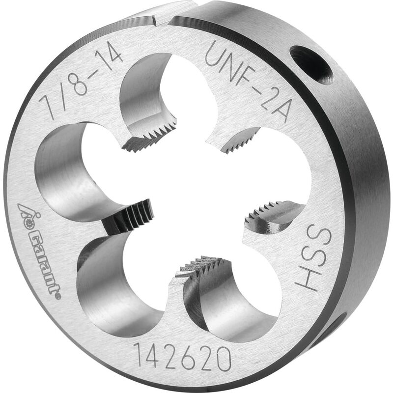 con imbocco corretto su entrambi i lati per agevolare l'esecuzione del filetto ed evacuare correttamente i trucioli nella direzione di taglio. Imbocco a 1 spira e 3/4. Uso: Per filettatura americana a passo fine UNF ASME − B1.1. Dati tecnici Acciaio < 750 N/mm² m/min idoneo Olio idoneo Acciaio < 500 N/mm² m/min idoneo a secco limitatamente adatto Alluminio (a truciolo corto) m/min limitatamente adatto Angolo di filetto Grad 60 Norma EN 22568 Classe di tolleranza 2A Materiale da taglio HSS Tipo di filettatura UNF Tipo di prodotto Filiere Misura del filetto 7/8-14 UNF Altezza, mm 16 Direzione di taglio destra Filetti per pollice 14 ⌀ Filettatura, mm 22,23 ⌀ Esterno, mm 55