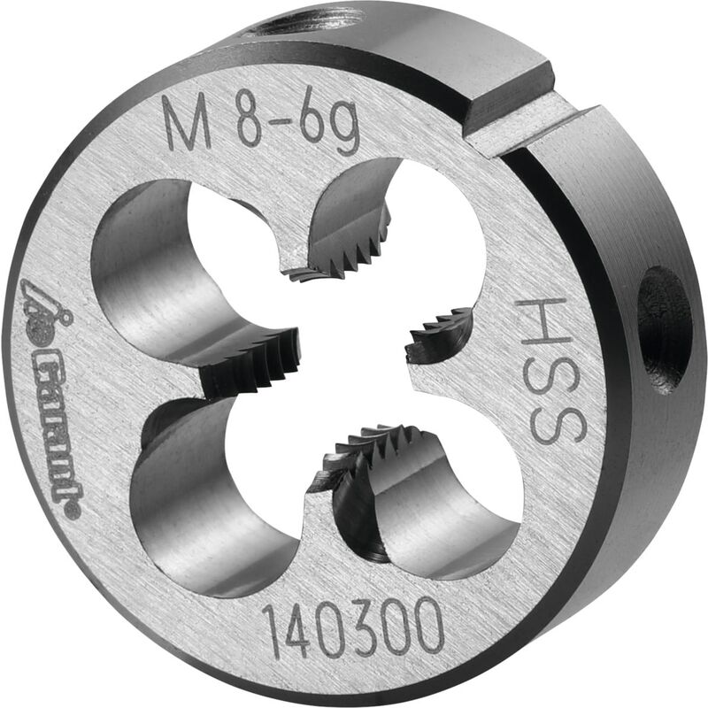 Forma chiusa preincisa. ≥ M3 con imbocco corretto su entrambi i lati per agevolare l'esecuzione del filetto ed evacuare correttamente i trucioli nella direzione di taglio. Imbocco a 1 spira e 3/4. Dati tecnici Alluminio (a truciolo corto) m/min limitatamente adatto a secco limitatamente adatto Olio idoneo Acciaio < 750 N/mm² m/min idoneo Acciaio < 500 N/mm² m/min idoneo Tipo di filettatura M Materiale da taglio HSS Norma EN 22568 Angolo di filetto Grad 60 Direzione di taglio destra Tipo di prodotto Filiere Misura del filetto M8 Classe di tolleranza DIN 13 6g Passo, mm 1,25 Altezza, mm 9 ⌀ Esterno, mm 25