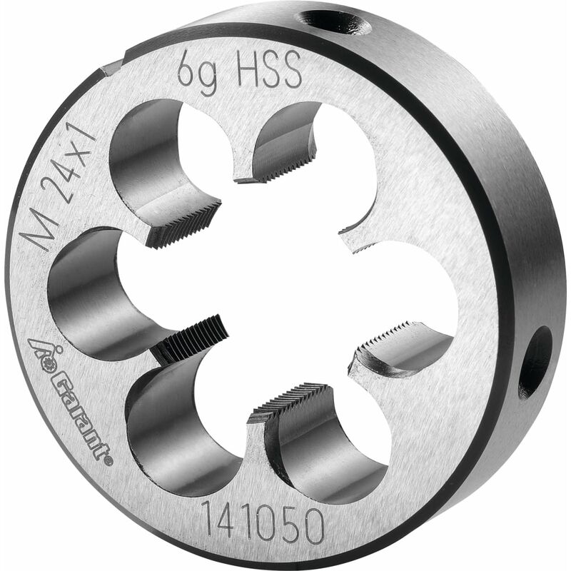 Forma chiusa preincisa con imbocco corretto su entrambi i lati. Imbocco a 1 spira e 3/4. Dati tecnici Olio idoneo Alluminio (a truciolo corto) m/min limitatamente adatto Acciaio < 500 N/mm² m/min idoneo a secco limitatamente adatto Acciaio < 750 N/mm² m/min idoneo Materiale da taglio HSS Tipo di filettatura MF Angolo di filetto Grad 60 Norma EN 22568 Direzione di taglio destra Tipo di prodotto Filiere Misura del filetto M24×1 Classe di tolleranza DIN 13 6g Passo, mm 1 Altezza, mm 16 ⌀ Esterno, mm 55