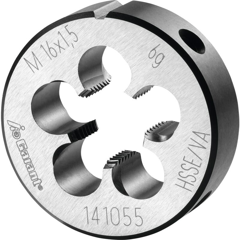 Forma chiusa preincisa con imbocco corretto su entrambi i lati. Imbocco a 2 spire. Lappate e nitrurate, angolo di spoglia superiore ca. 15°. Per acciai ad alta resistenza e inossidabili. Dati tecnici INOX < 900 N/mm² m/min idoneo a secco limitatamente adatto Acciaio < 1100 N/mm² m/min idoneo Acciaio < 1400 N/mm² m/min limitatamente adatto Acciaio < 750 N/mm² m/min idoneo Acciaio < 900 N/mm² m/min idoneo Olio idoneo Acciaio < 500 N/mm² m/min idoneo INOX > 900 N/mm² m/min limitatamente adatto Direzione di taglio destra Angolo di filetto Grad 60 Materiale da taglio HSS E Norma EN 22568 Tipo di filettatura MF Tipo di prodotto Filiere Misura del filetto M16×1,5 Classe di tolleranza DIN 13 6g Passo, mm 1,5 Altezza, mm 14 ⌀ Esterno, mm 45